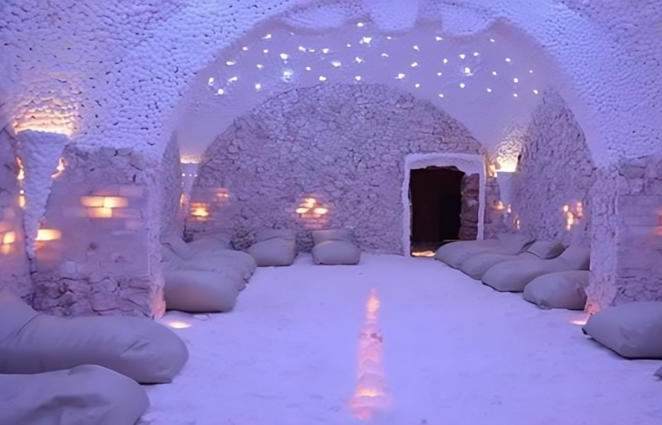 Por la mañana, después de desayunar, te aislarás durante 45 minutos, te sentirás aislado del mundo, sin nada a tu alrededor excepto el olor a yodo y la sensación de la sal gruesa sobre tu cuerpo dentro de la cueva de sal .